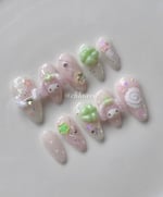 Absolutely adorable My Melody nails with a sweet twist! Featuring hand sculpted strawberry My Melody charms, clover detailing, and lots of confetti stars!